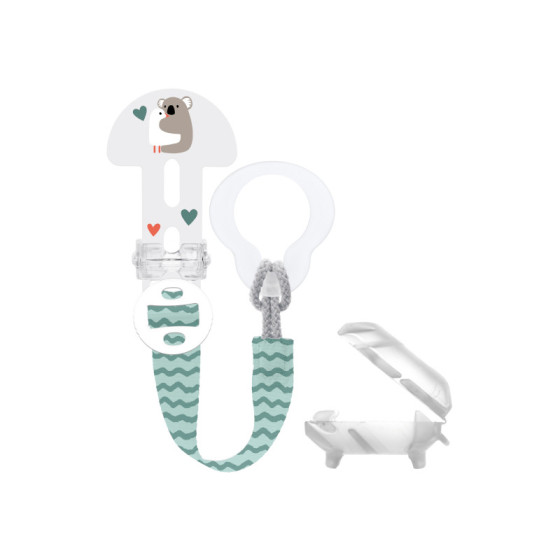 Umożliwia przyczepienie smoczka do dziecięcego ubranka przez co zapobiega jego upadkowi na brudne podłoże oraz zgubieniu go.